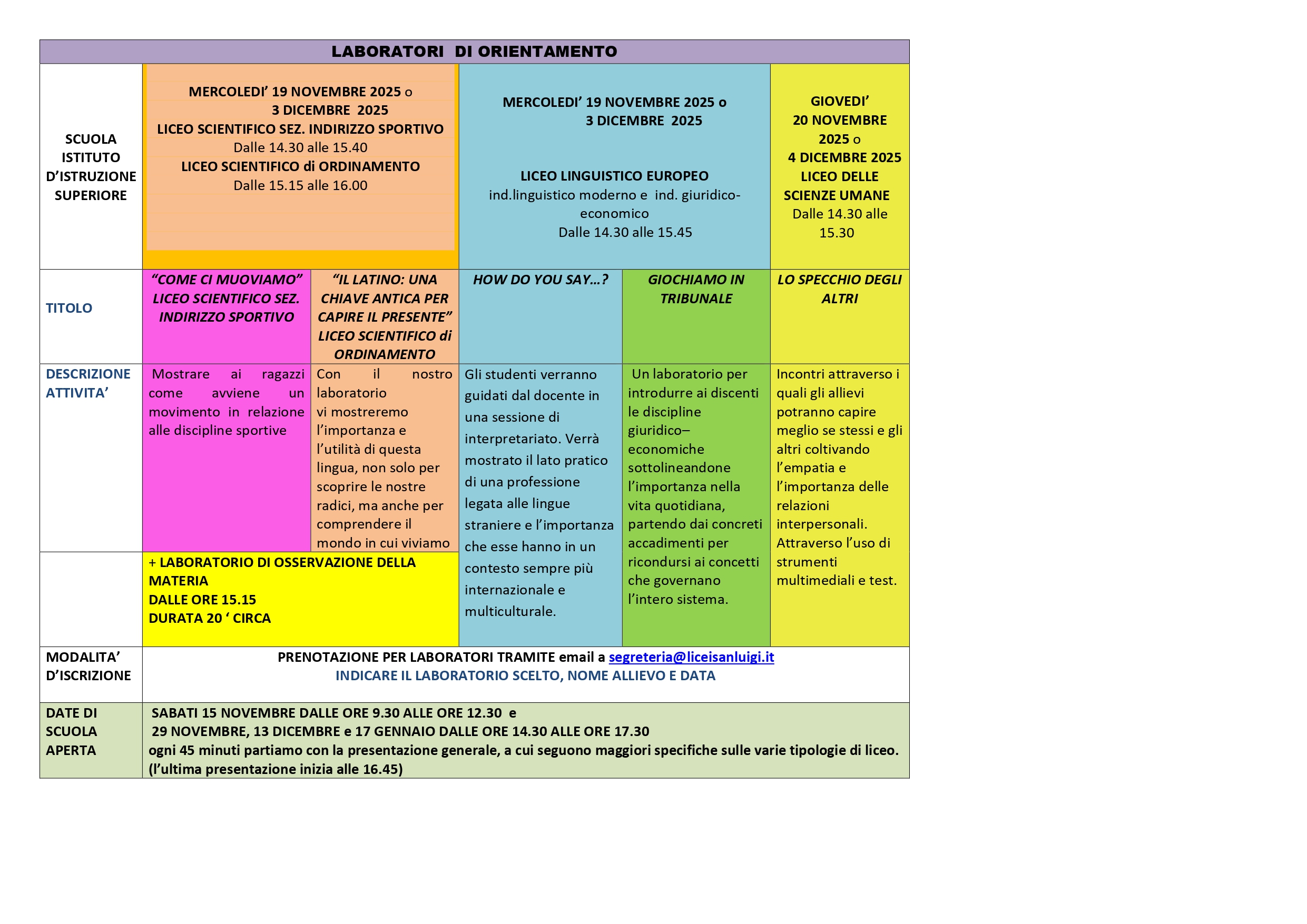 NON SERVE PRESENTAZIONE, basta solo tener presente che ogni 45 minuti partiamo con la presentazione generale, a cui seguono maggiori specifiche sulle varie tipologie di liceo. (l’ultima presentazione inizia alle 11.45 ALLA MATTINA E ALLE 16.45 IL POMERIGGIO)